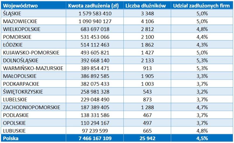 Polski przemysł najbardziej zadłużony jest w woj. śląskim z łączną kwotą sięgającą prawie 1,6 mld zł niespłaconego długu.