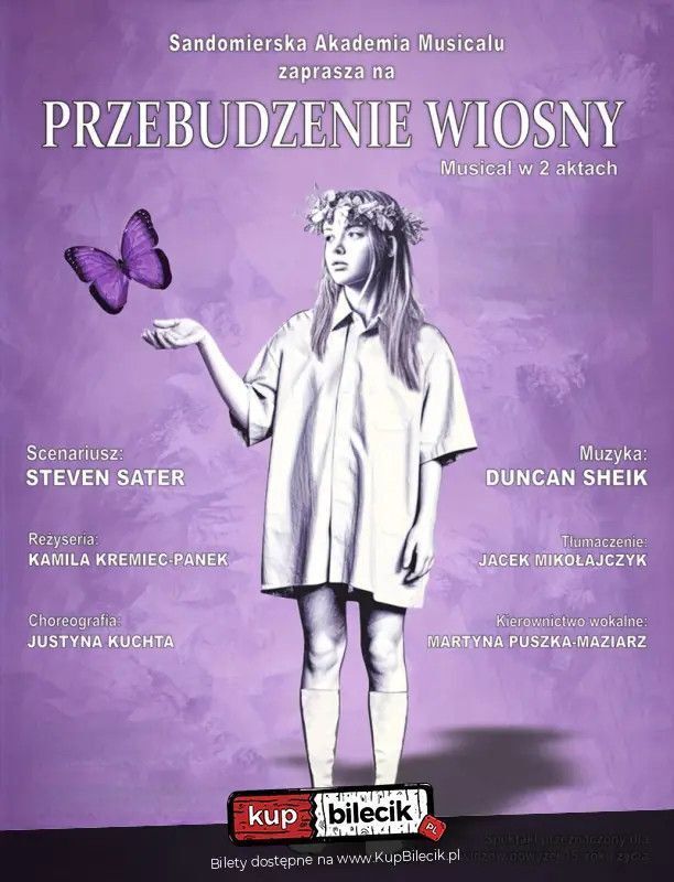 "Przebudzenie Wiosny" od 2006 roku jest wystawiane przez teatry i grupy amatorskie na całym świecie, w związku z czym zyskało już miano produkcji kultowej. To poruszający spektakl, w którym sceny dramatyczne opatrzone są niezwykle klimatyczną muzyką oraz widowiskowymi układami choreograficznymi. Oparty na dramacie Franka Wedekind"a musical opowiada o niepokojach nastolatków związanych z budzącą się seksualnością, o lękach związanych z wszechobecnym cierpieniem i przemocą, a przede wszystkim o proteście nastolatków wobec systemu nakazów i zakazów narzuconych przez dorosłych. Mimo, iż akcja musicalu rozgrywa się w XIX wieku, wszystkie tematy w nim zawarte są niezwykle uniwersalne i idealnie wpasowują się we współczesną rzeczywistość…